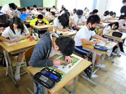6年生は図工でカラフルなお菓子のパッケージの一部を切り取って、そっくりにそこの部分を描く作品作りをしています。