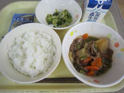 ごはん、肉じゃが、ごまあえ、ミニフィッシュ、牛乳 です。