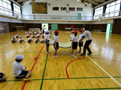 1年生は体育でマット運動をするので、班ごとに並んで、マットの運び方を教わりました。みんな張り切ってがんばっていました。