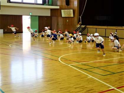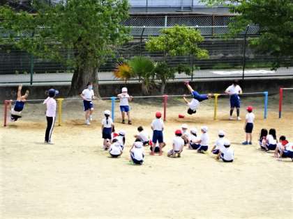 体育では、体育館で順番に思いっきり走ったり、運動場では鉄棒の逆上がりの練習をしました。