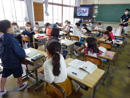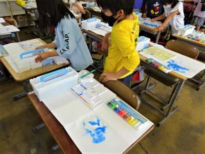 図工では画用紙を水の筆で湿らせて、絵の具でにじみの模様をつくる学習をしました。休み時間になった時も、互いのできた模様を見合っていました。