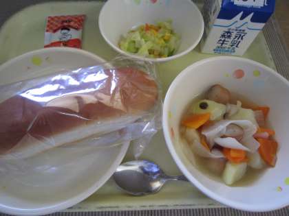 コッペパン、ポトフ、洋風野菜炒め、ミルクバター、牛乳 です。