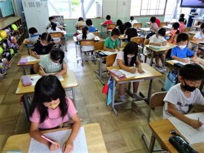 1年生は国語で、今まで習ったひらがなを書くテストをしました。