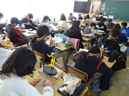 図工では「将来なりたい人」や「将来やりたいこと」のテーマで立体表現をしています。紙粘土で形を整えて、色も付けると子どもたちの夢が形になってきました。