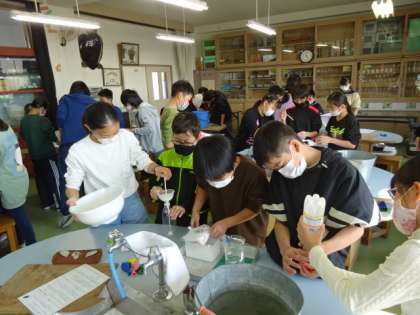 理科ではお楽しみの実験で「ダイラタンシー風船」というものを作りました。片栗粉を水でよく溶いて、風船に注入します。