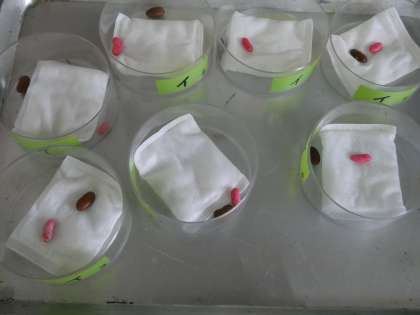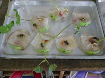 5年生の教室のうしろで植物の生育をしていました。種からニョキニョキと芽が出て、成長しています。