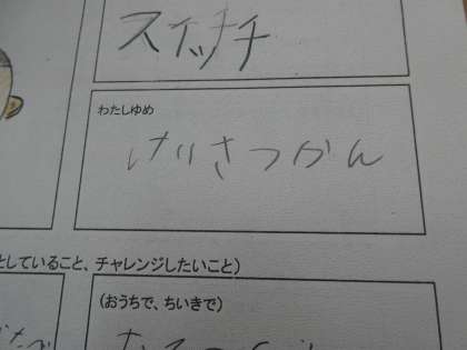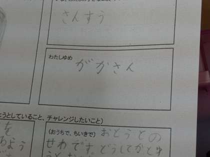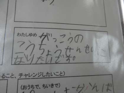 みんながいろんな夢を書いてくれていて本当にうれしく思いましたし、応援したい思いでいっぱいです。そんな中、子どもが「校長先生、見て!」と声をかけてくれて見せてくれたのが、「がっこうのこうちょうせんせいになりたい」でした。あらためて子どもたちの夢のためにもがんばりたいと決意した瞬間でした。