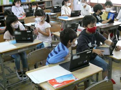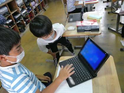 タブレットを使って3年生が授業をしていました。お友だちと相談しながら調べ物をしています。みんなしっかり学び合いをしていました。