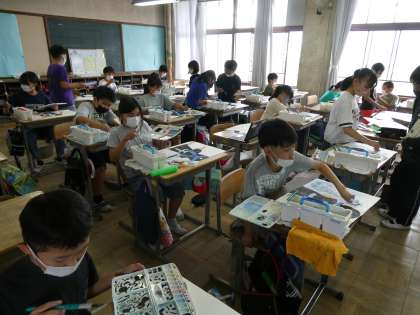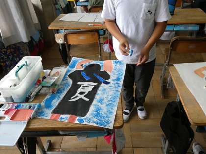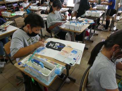 5年生も図工の時間でした。絵を描くことはとてもよい時間です。みんな上手に、テクニックを使って描いていました。これはもしや運動会の「泉 ENJOY ソーラン」のハッピでは。