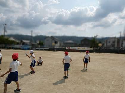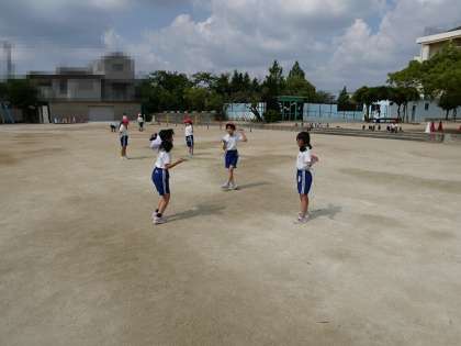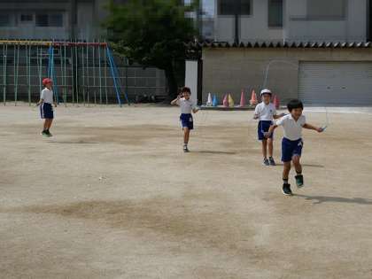 マスクを外しての指導、体育時間中の水分補給の促し等をすすめております。距離を取っての運動であったり、特に屋外の体育授業等においては熱中症対策を最優先しての指導をすすめています。2年生の縄跳び運動の様子です。