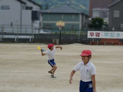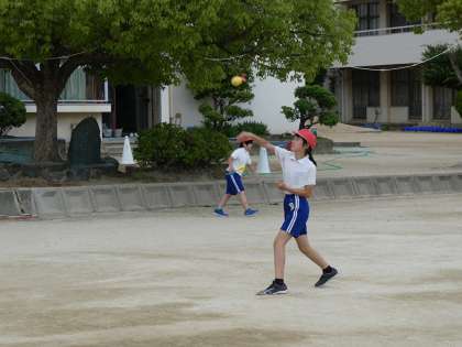5年生の体育授業となります。遠投を行っていますが、マスクを外して行っています。各種熱中症防止策をとっておりますが、万一、体調不良者等が出た場合には即座の対応を行うよう教職員内でも十二分に注意していきます。