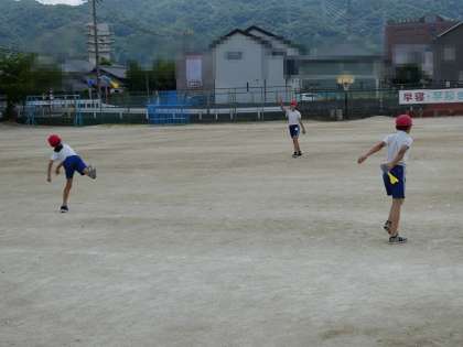 子どもたちが遠投していたものは、「ジャベリックボール」という投てきをするグッズです。うまく投げられると音がなります。子どもたちの運動能力の向上、それが集中力等の向上にもつながると考えています。