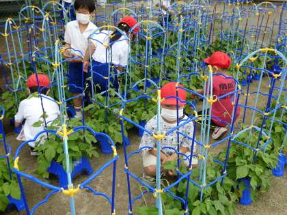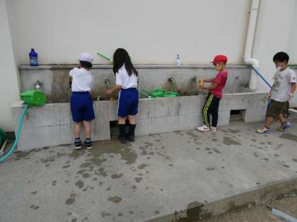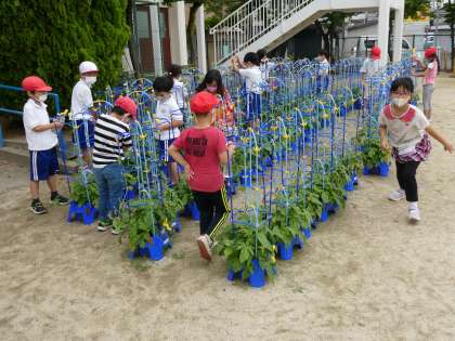 1年生の子どもたちが今日も朝の水やりをしていました。どんどんアサガオも成長しています。
