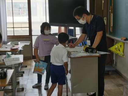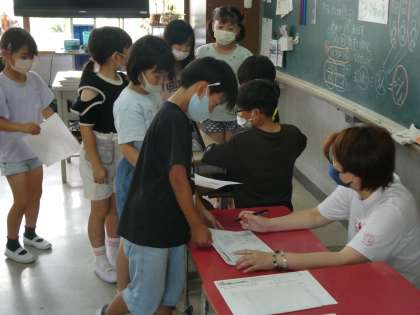 先生たちに問題を解いた答え合わせをしてもらっています。みんな「正解!」とほめてもらっていました。やっぱり「〇(まる)」をもらえるとうれしいですよね。