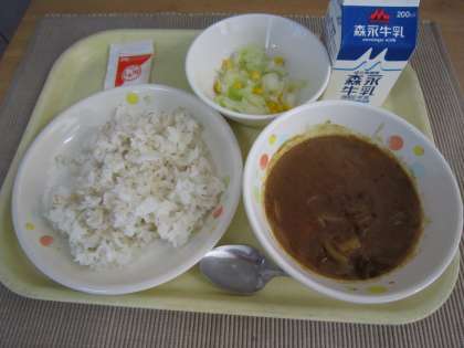 麦ごはん カレーシチュー キャベツとコーンのサラダ ノンエッグマヨ 牛乳
