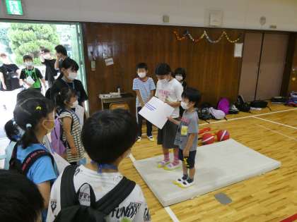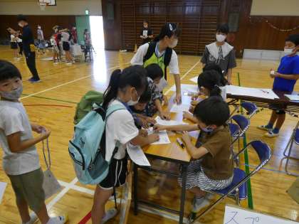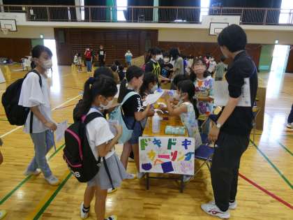 体育館や教室でまつりがスタートしています。まずはしっかり受付とゲーム説明です。