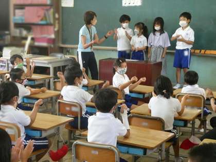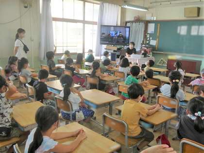 1年生は朝礼集会のあとに広島の原爆の話を聞いて、折り鶴をなぜみんなで作るかの学びをしていました。隣のクラスではみんなで言葉遊びをしていました。
