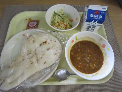 給食のキーマカレーは、合挽肉に加えひきわり大豆も入り、栄養たっぷりです。カレーに入っているので、豆が苦手な子も食べやすいようです^^