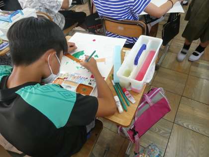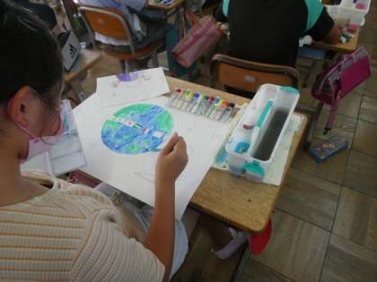 6年生のみんなが絵を書いていました。地球や平和をイメージした絵のようです。世の中では戦争が行われたりしていますが、改めて平和をみんなが願ってほしいと思います。この絵の時間は広島の修学旅行での平和学習にもしっかり繋がりそうですね。