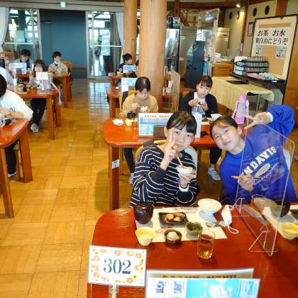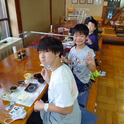 朝食タイムです。鮭やウィンナー、ひじきなどです。今日一日のエネルギー充電です。