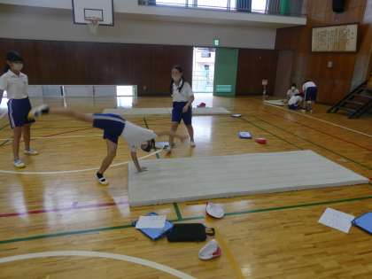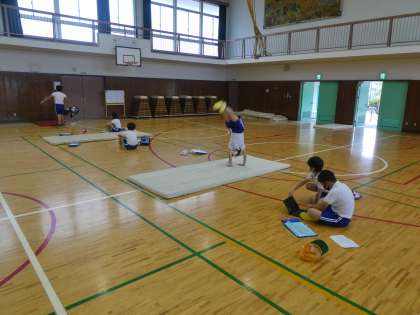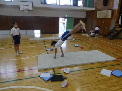 5年生がマット運動の体育授業を行っていました。運動すると脳への刺激もありいいですよね。みんなの動きを動画におさめてお互いにチェックし合うのもいいですね。