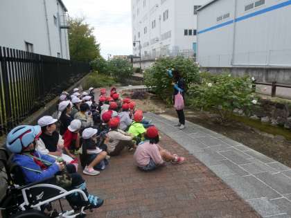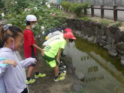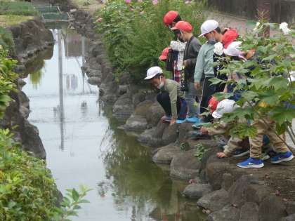 南新田ふれあいせせらぎの径にもいきました。みんなで水辺や花だんを探索しています。自分たちでいろんな生き物を探したり、環境をキレイに保つことの大切さをここから学んでほしいです。