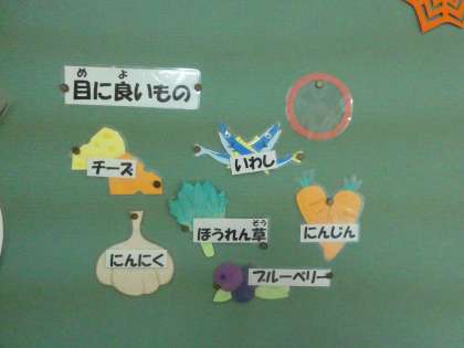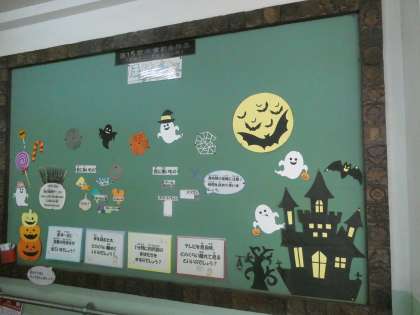 養護の先生が保健の掲示板を更新してくれました。今回は「目の健康」についてです。季節に合わせて、今回はハロウィン創作です。キレイに作られてますね。