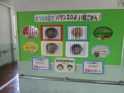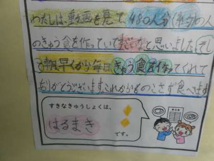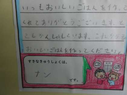 給食室近くの掲示板にいろんなものが掲示されていました。不思議な見え方をする掲示板やいつも美味しい給食を作ってくれる調理員さんへのメッセージがたくさん貼られていました。感謝の気持ちを言葉にすることはとてもよいことですね。