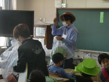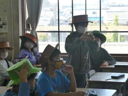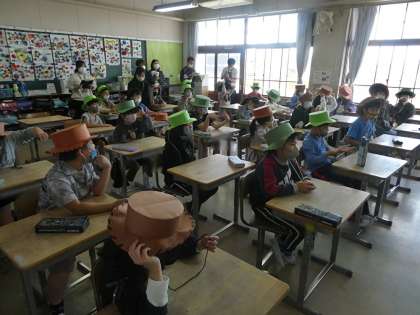今日は市教委の先生にも指導に来ていただき3年生の校内研修授業を行いました。先生も国語の授業でしたが山小屋での探検家の話ということで自身も探検家になって登場しました。子どもたちも楽しく授業をスタートしていました。なんと子どもたちにも帽子を用意してくれていました。みんな似合ってます。勉強を楽しくする、楽しく学ぶことを実践してくれました。
