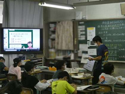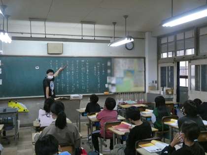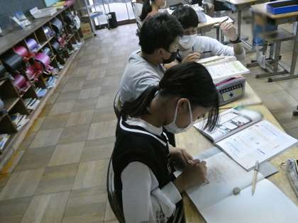 5年生は国語で暗唱できるように発声しながら確認していました。保護者の皆さんも「秋の夕暮れ」は子どものころに暗唱しませんでしたか。隣のクラスは算数の時間で単位量あたりの大きさという学びでした。教育実習生の先生も子どもたちの机を回ってサポートしていました。