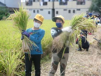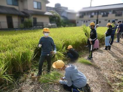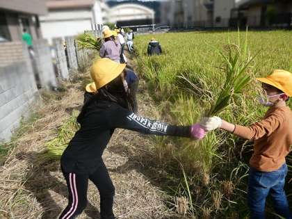 刈った稲をしっかり束ねていました。チームワークもばっちりです。