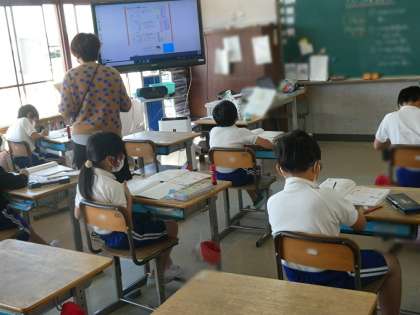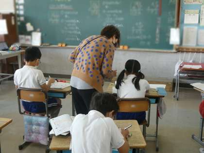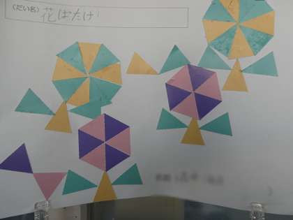 算数の授業でかけ算を行っていました。振り返り学習はとても大切ですね。先生から正解の丸サインもらえるとうれしいですね。教室の外にみんなが作成した三角形を組み合わせた貼り絵が掲示されていました。いろんな組み合わせがされていて、幾何学模様のようなものもありました。