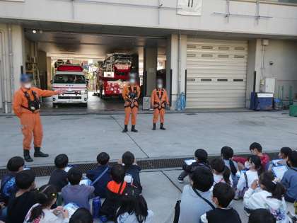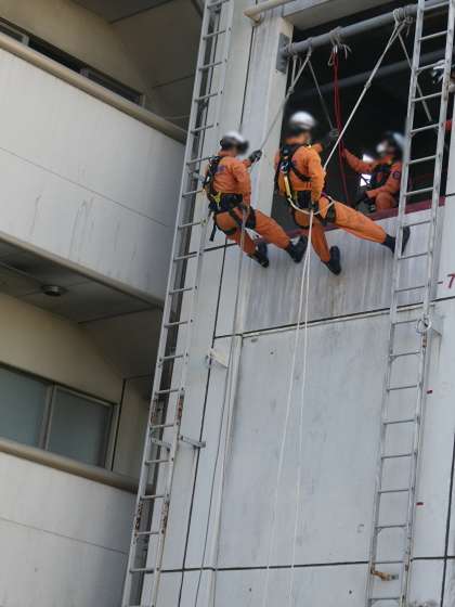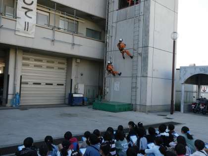 高いところから降りてくるレスキュー隊の方は本当にかっこいいですね。でもいつも町の安全を守ってくれている方です。いつもみんなで応援しましょうね。