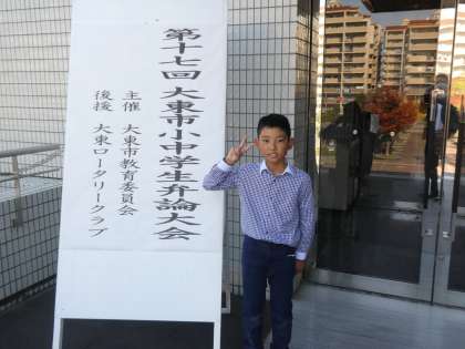 今日は大東市小中学生弁論大会が開催されました。泉小学校からは学校紹介スピーチに5年生の代表児童が臨みます。会場に向かうために校長室で給食を食べて移動しました。泉小学校のみんなが応援しています。