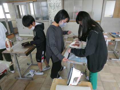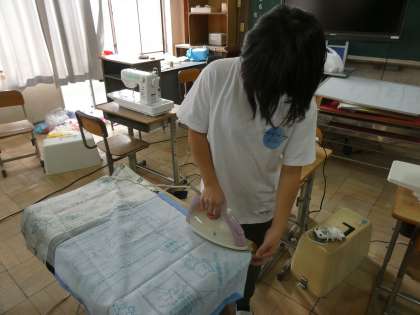 6年生がアイロンがけをしていました。エプロンのアイロンがけをしているようでした。みんなお家でお手伝いをしているのかすごくうまくできていました。お家でのお手伝いは「一日一善」の取組みでもありますよね。