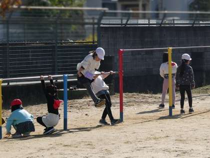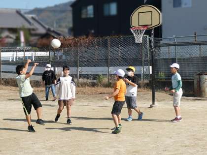 みんな元気にバスケットや鉄棒などをして運動場で遊んでいます。天気もよいので太陽の光を浴びてみんな楽しそうです。