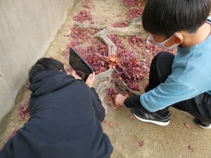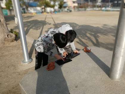 以前にご紹介したシーサーをいろんな背景の中で撮影していました。枯れ葉であったり、ジャングルジムであったり、いろんなところで撮影がされていました。みんなとても楽しそうです。