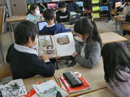 本の読み聞かせの時間でした。班で順番に本読みと感想を伝えるという学びの時間のようです。