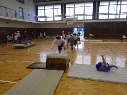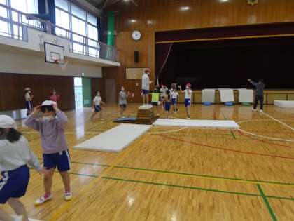 3年生と5年生の合同での体育授業を体育館で行っていました。サーキット的な動きでそれぞれの班で動きを決めて取り組んでいました。演出もいろいろと考えていました。