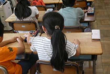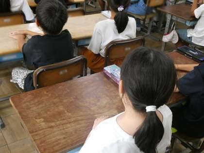 まずは机の上の整理からスタート。みんな筆箱をしっかり端に置いて、授業をスタートする準備がばっちりです。