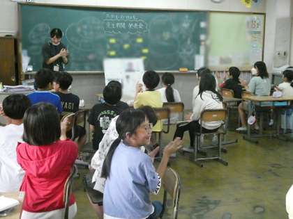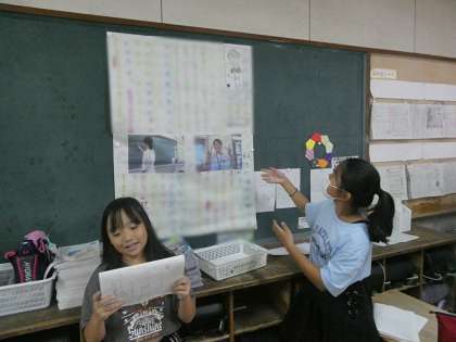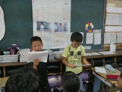 4年生のクラスで先生新聞というものを作成して、その発表会を行っていました。これまでがんばってインタビューしたり、写真撮影をしたりとがんばって制作した新聞です。