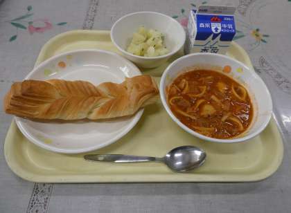 今日はデニッシュパンとチリコンカーン、じゃがバターでした。チリコンカーンはメキシコ料理で、豆やひき肉を煮込んで、トマト風味のメニューです。
