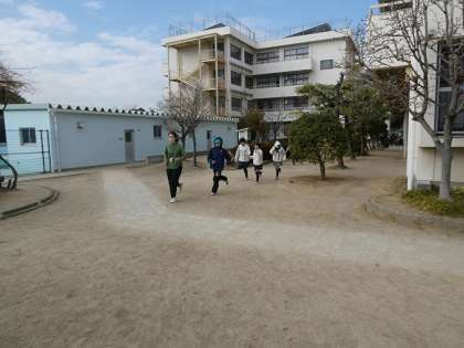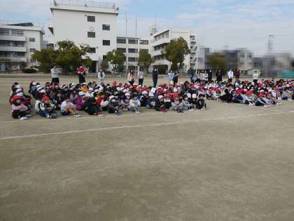 運動場で遊んでいた子どもは中央に座って集まり、校舎内にいた子どもたちは揺れがおさまった後に、各教室から運動場へ避難をしました。