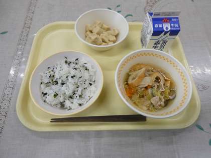今日はみんなが大好きな青菜わかめご飯です。そしてきりたんぽ風と高野豆腐の含め煮です。