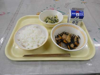 今日はいそ煮と切り干し大根のおひたしでした。いそ煮は鶏肉やがんも、ひじき、こんにゃくなど具沢山で美味しかったです。