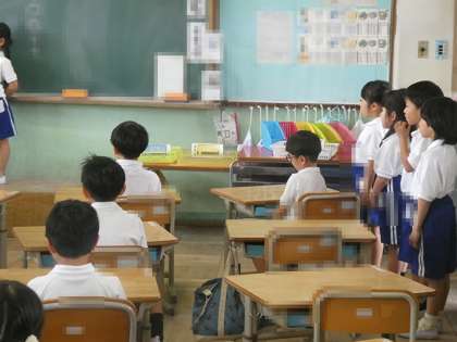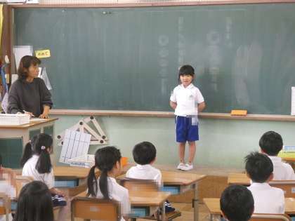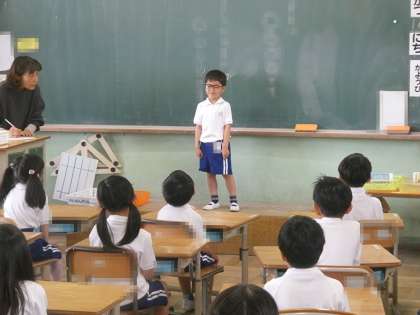 1年生がお友だちに自己紹介をしていました。発表するときもお友だちの発表を聞くときもしっかりできていました。