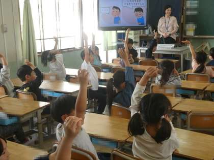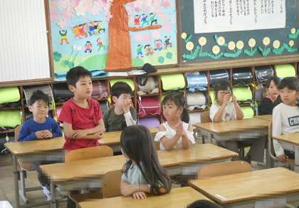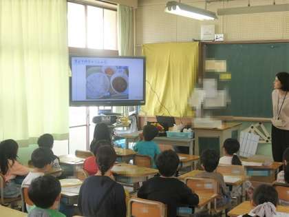給食が始まる前に栄養教諭の先生が1年生のみんなに給食のことをいろいろと教えてくれました。