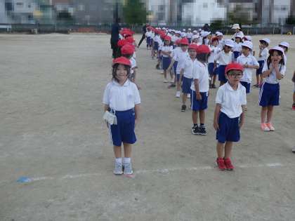 1年生が運動会での入退場の練習をしていました。しっかり整列できるかな。