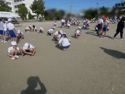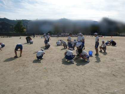 開会式の練習のあとは、みんなで運動場の石拾いです。