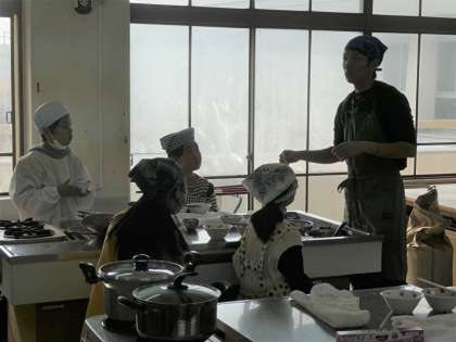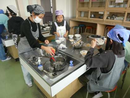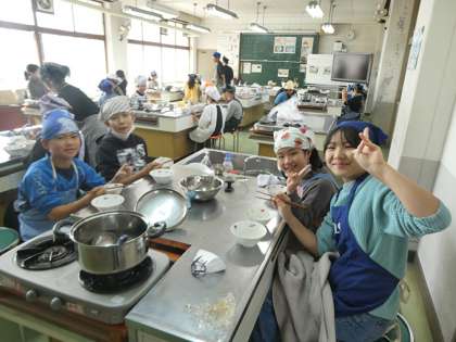 5年生が家庭科室で調理実習をしていました。ご飯とお味噌汁づくりのようです。